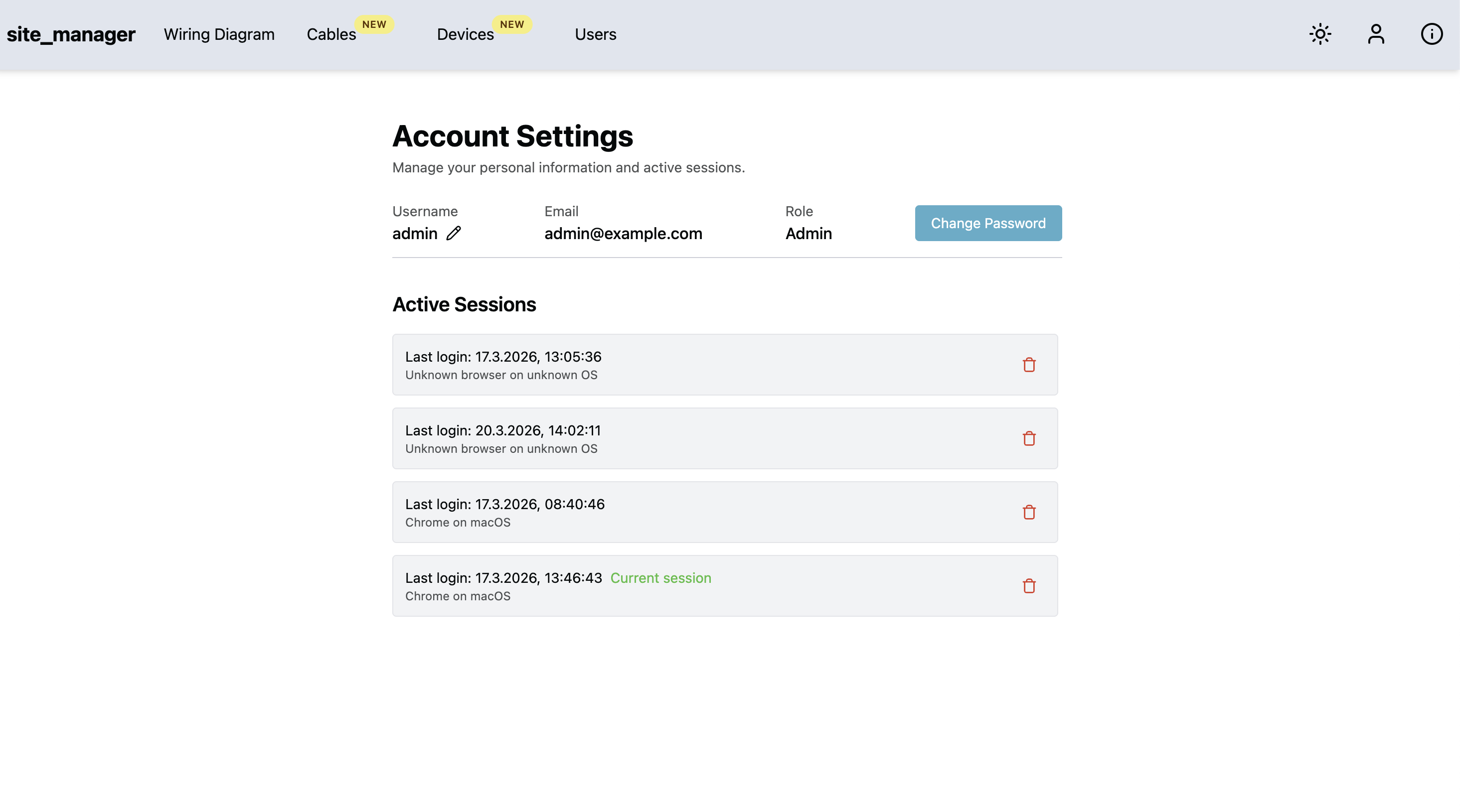 Account The account page shows basic information about your account. You can change your username and password on this page. You can also see all your active sessions and close them.