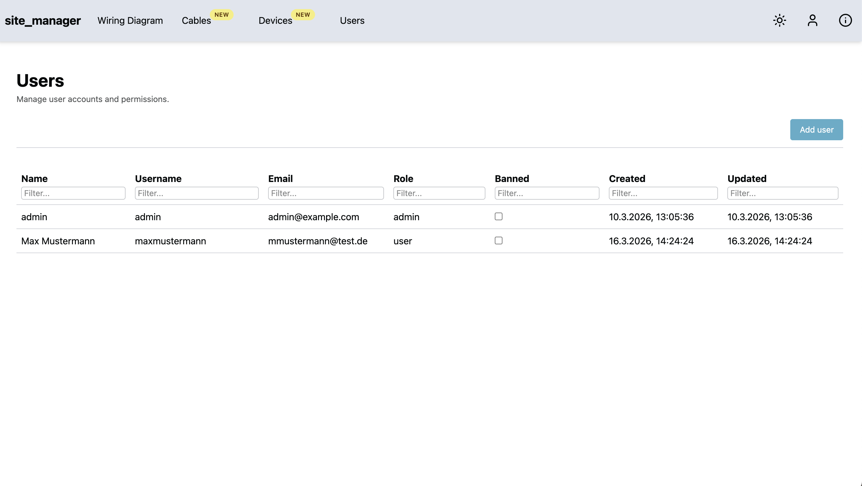 Users Note This page is only accessible to admin users! On the users page you see a list of all users of the system as well as their role. You can add new users and ban existing users.